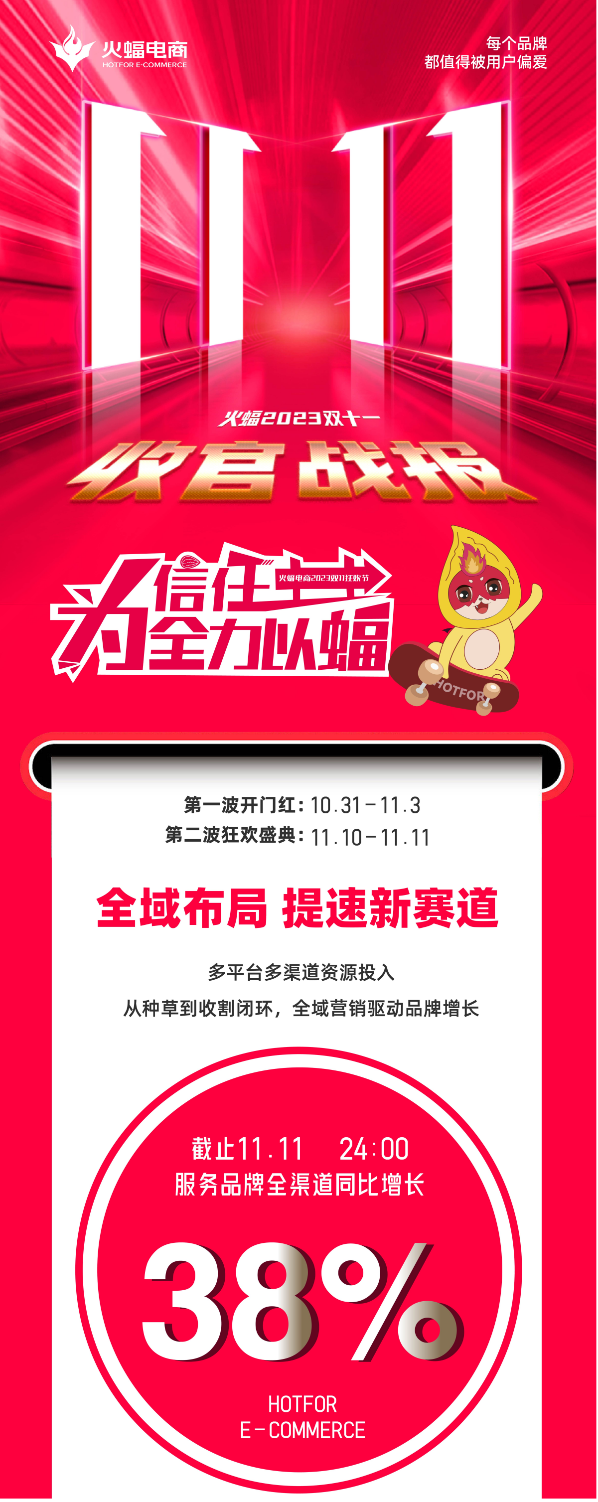 隨著今年雙十一落下帷幕,各平臺、品牌、商家大促成績表現(xiàn)如何,成為大家議論的熱點。近日,知名品牌電商服務(wù)商,火蝠電商公布了2023年雙十一戰(zhàn)報。戰(zhàn)報顯示,在今年雙十一期間,截止11月11日24點,服務(wù)品牌全渠道增長38%,各平臺、各類目數(shù)據(jù)均保持較好表現(xiàn)。