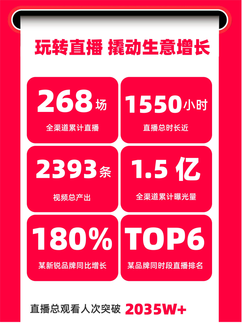 內(nèi)容營銷方面,憑借高效資源整合、溝通場景的精準打造和創(chuàng)意內(nèi)容匹配。本次雙十一,火蝠電商在“直播”和“短視頻”上持續(xù)發(fā)力,全網(wǎng)累計曝光量超1.5億,全渠道累計直播場次達268場,直播觀看人數(shù)超2035萬,視頻總產(chǎn)出量、品牌全渠道曝光等方面數(shù)據(jù)表現(xiàn)突出。